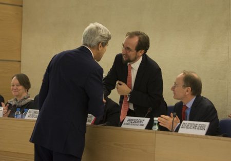 UN High Commissioner for HR shaking hands with former US Secretary of State John Kerry. (If by accident their speeches were switched nobody would notice!)