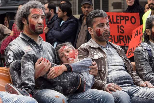This is not Aleppo, Syria, but rather the streets of Europe where a recent “save Aleppo” protest was staged. Actors posing in fake dust and blood proved just how easy it is for anyone to create “war victims” anytime, anywhere.