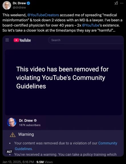 This isn’t the first time YouTube has targeted Dr. Drew’s content. He noted that previous strikes were resolved after discussions between his production team and YouTube officials. Despite the latest removals, Pinsky confirmed that the videos remain accessible on X, suggesting that alternative platforms may offer more space for unrestricted conversations.